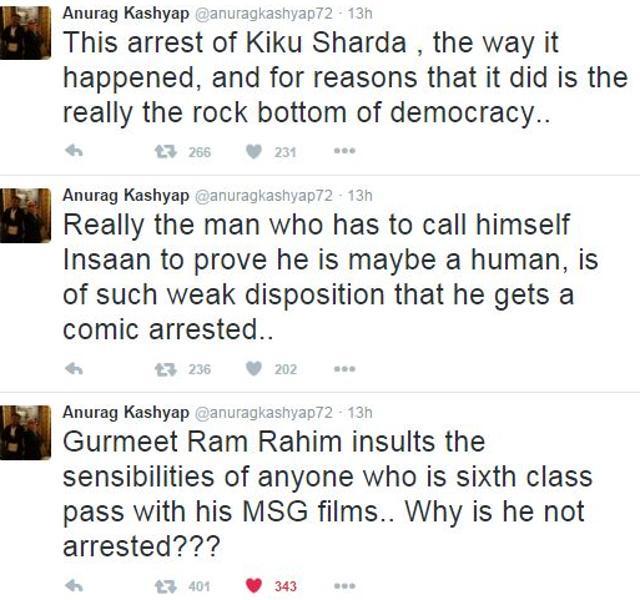 Filmmaker Anurag Kashyap minced no words when he took to Twitter late on Wednesday and wrote, “Gurmeet Ram Rahim insults the sensibilities of anyone who is sixth class pass with his MSG films… Why is he not arrested??? Really the man who has to call himself Insaan to prove he is maybe a human, is of such weak disposition that he gets a comic arrested.. This arrest of Kiku Sharda , the way it happened, and for reasons that it did is the really the rock bottom of democracy.”