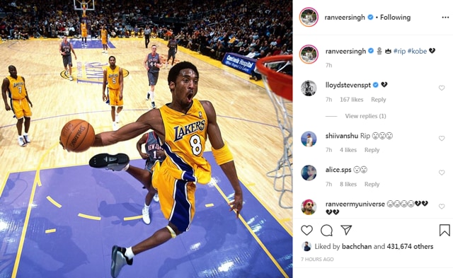 Ranveer Singh posted a stunning picture of Kobe in action on Instagram and captioned it, “#rip #kobe” along with basketball and crown emojis.