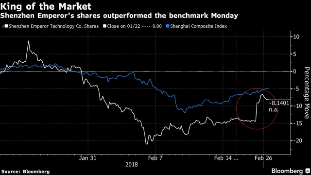 Likewise, shares of Harbin Viti Electronics Co., which has a Chinese name that means “powerful emperor,” jumped 4.4%, and Vatti Corp., a stove and water heater manufacturer called “Chinese emperor” in Mandarin, rose 1.7% to a three-week high. The shortened name for Jiangxi Huangshanghuang Group Food Co., which climbed 2.9%, roughly translates as “king of kings.”