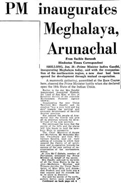 Earlier in the day Mrs. Gandhi inaugurated Arunachal Pradesh, the Land of Sun Rise, at Ziro in Subansiri district of the erstwhile Northeastern Frontier Agency (NEFA). Inaugurating the new Union Territory Mrs. Gandhi said its creation “was a very bold and big step” towards the political and economic development of the vital frontier province.