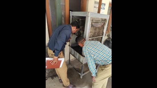 A health department team inspecting for mosquito larvae in a desert cooler at Police Line, Ludhiana, amid a dengue scare. (Harvinder Singh/HT)