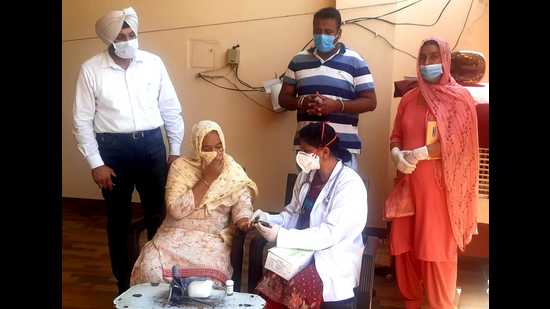 An elderly woman being checked at Kalanaur in Gurdaspur district.