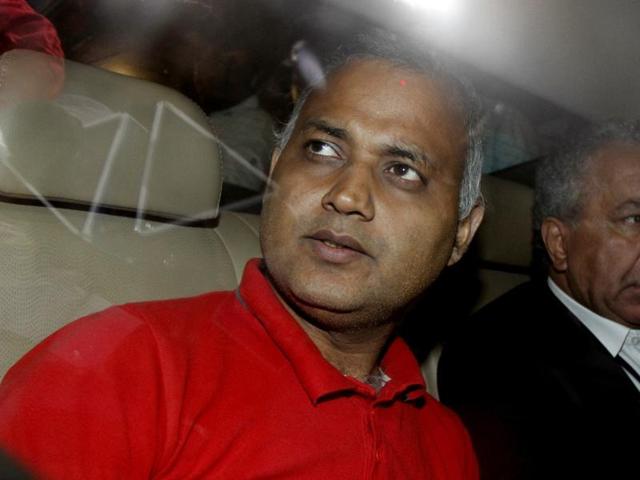 AAP MLA Somnath Bharti arrives to surrender at the Dwarka North Police Station on September 28. (Virendra Singh Gosain/HT file photo)