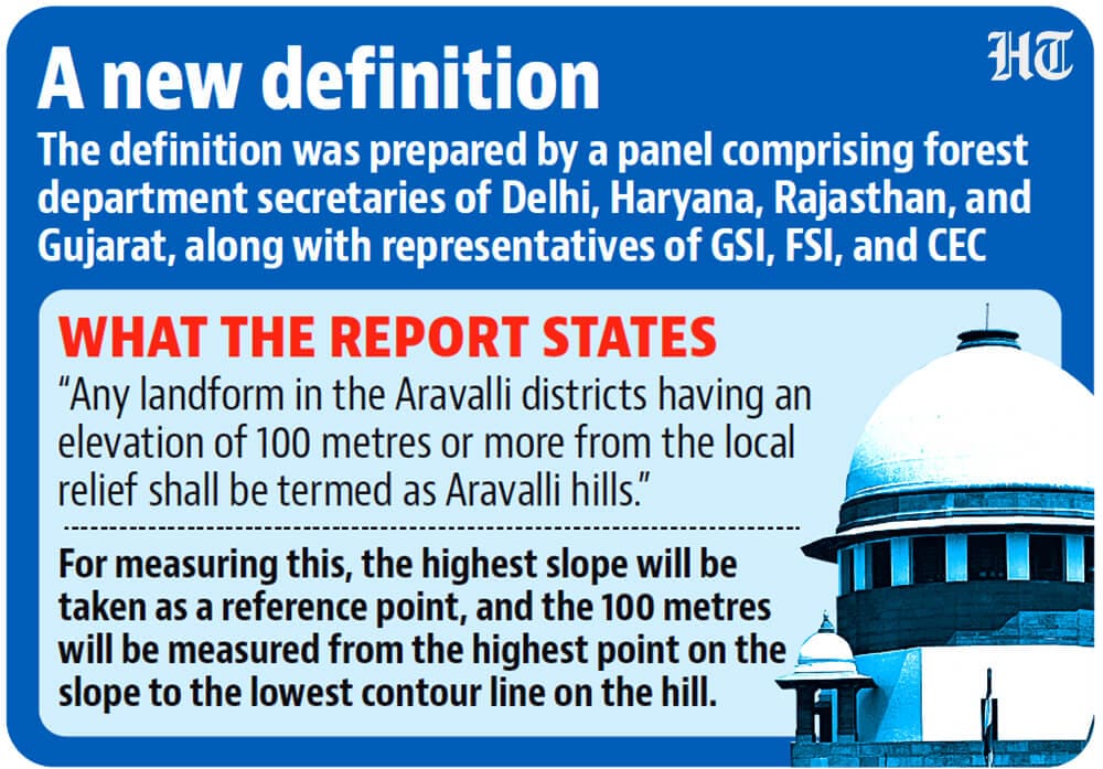 More than a year after the Supreme Court entrusted the Centre with the task of defining the Aravalli Hills and Ranges to curb illegal mining, a high-level committee headed by the Union environment secretary has submitted its report to the court, proposing that any slope with a height of more than 100 metres, measured from the top, will qualify as Aravalli hills.