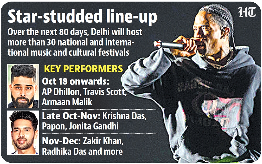 The upcoming calendar features a diverse lineup of Indian and international performers, including Travis Scott, Krishna Das, Zakir Khan, Papon, AP Dhillon, Armaan Malik, Jonita Gandhi and Radhika Das. The events, to be held from October 18 through December, will be jointly organised by the Delhi government, the Event and Entertainment Management Association (EEMA), and the PHD Chamber of Commerce and Industry (PHDCCI).