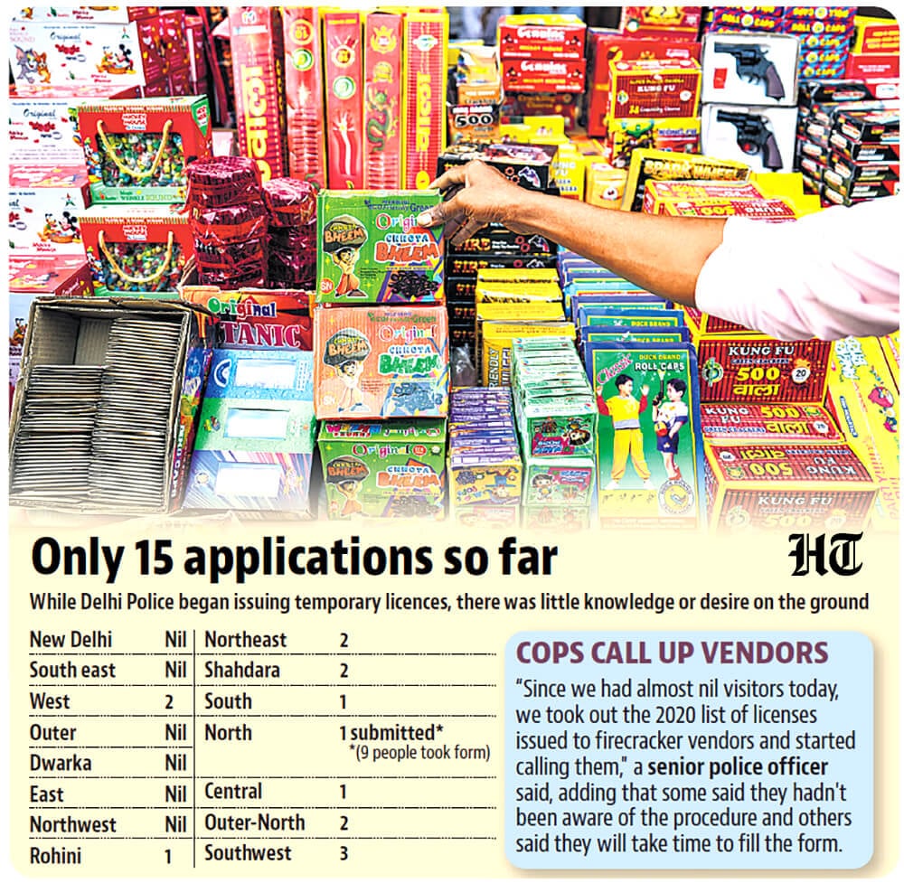 A day after the Supreme Court opened a narrow window for regulated Diwali celebrations, Delhi’s firecracker traders on Thursday responded with indifference to the government’s two-day drive, with only 15 traders across the city applying for temporary licenses to legally sell firecrackers in the Capital, police said.