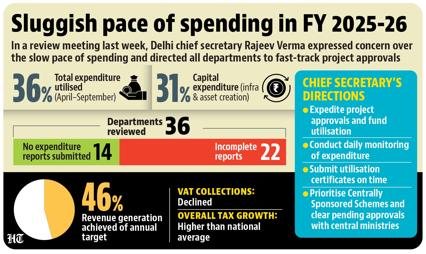 The Delhi government has spent just 36% of its total budgeted expenditure in the first six months of the 2025–26 fiscal year, with capital expenditure – meant for long-term infrastructure and asset creation – lagging even further at 31%, according to officials aware of the matter.