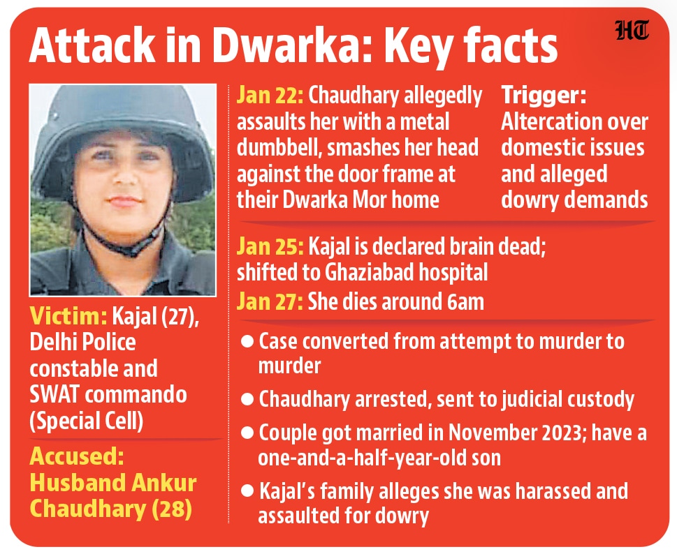 After allegedly assaulting his wife, Kajal, following an altercation over domestic issues and dowry demands, the accused, identified as Ankur Chaudhary (28), called Kajal’s brother, Nikhil, a Delhi Police constable, and told him that he had killed his sister, police said, citing Nikhil’s statement.