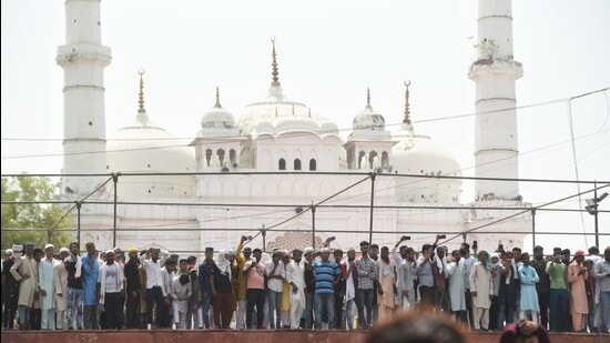 A massive crowd at Tilewali mosque in Lucknow for Friday namaz. (Deepak Gupta/HT)
