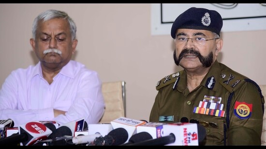 Additional chief secretary (ACS), home, Awanish Awasthi and UP police additional director general (ADG), law and order, Prashant Kumar at a press meet in Lucknow on Wednesday. (HT photo)