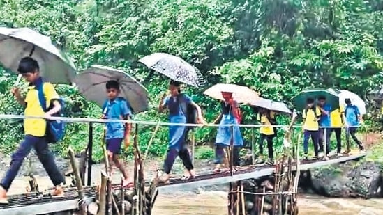 Last Thursday, as the stream swelled owing to heavy rainfall, a student was swept away before being rescued by locals. The incident prompted residents to hold a meeting on Friday, where they decided to build a traditional tribal-style bridge at the site. They agreed to collect donations and contribute labor according to their means.