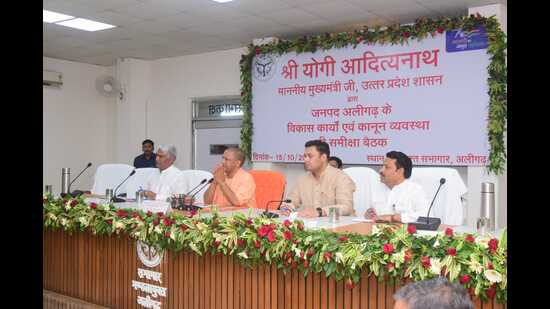 Chief minister Yogi Adityanath at a review meet in Aligarh on Saturday. (HT PHOTO)