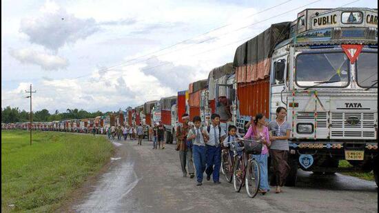 Stationed trucks on the outskirts of Imphal during an earlier blockade by tribal agitators. (File Photo)