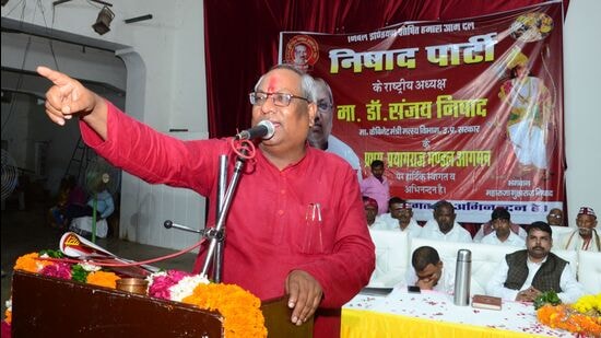 Cabinet Minister Sanjay Kumar Nishad addressing a meeting in Prayagraj on Saturday (HT Photo)