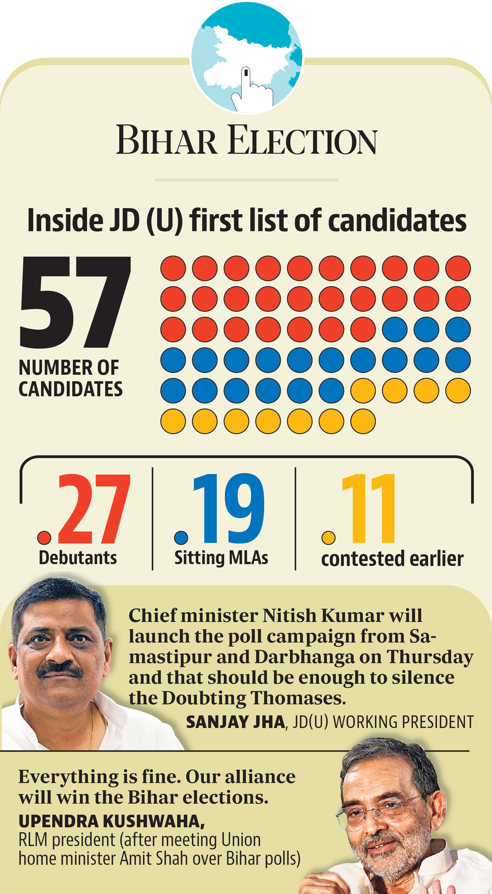 PATNA: Even as tussle over ticket distribution continues in the National Democratic Alliance (NDA) in Bihar, the Janata Dal (United), which has got 101 seats for 243 member state assembly, released its first list of 57 candidates, including on four seats said to be allocated to Chirag Paswan’s Lok Janshakti Party (LJP(RV).