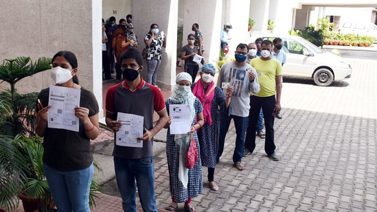 Jharkhand state government employees standing in a queue with the Aadhaar card to get the Covid-19 vaccine at Nepal House Secretariat in Ranchi on Wednesday. (ANI)