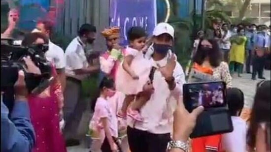 A huge number of cricket fans gathered to cheer for Rahane who met his wife and daughter after months. Flowers were showered on him while dhol and trumpets made it a festive atmosphere.