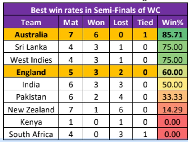 Such has been their form in World Cups, that Australia have featured in 7 semi-finals of this marquee event since their debut season in 1975, and they share this number with New Zealand. And they have never lost a semi-final fixture - 6 wins and 1 tie (against South Africa in 1999).