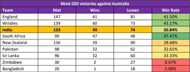 However, India’s win rate against the five-time World Champions isn’t the best as they stand at fourth in the list behind South Africa (47%), Windies (43%) and England (41%).