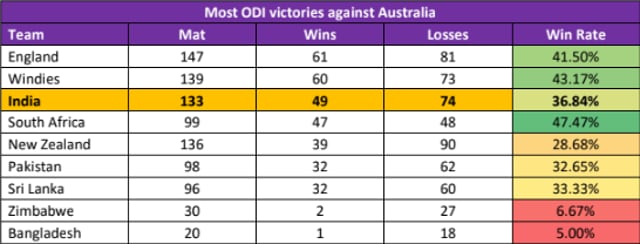 If they manage to do so, India will become only the third country to complete 50 ODI wins against Australia. Only England and Windies have managed to do so thus far.