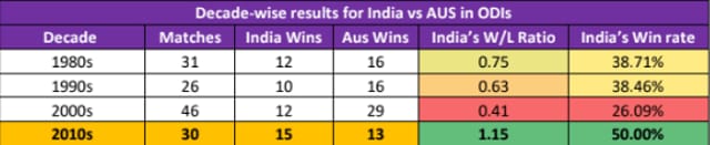 India have massively improved upon its record against Australia this decade. For the first time, the ‘Blue Brigade’ have won more matches than they have lost in a decade against the Aussies.