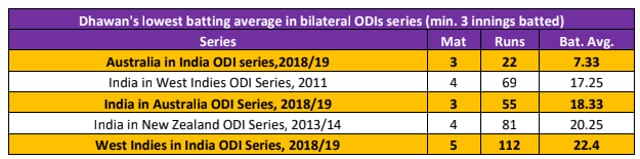 In the series so far, Dhawan has aggregated just 22 runs at an average of 7.33 which is his lowest average in a series with minimum 3 innings batted. Amongst the lowest five we can see three of them have come in the recently concluded ones.