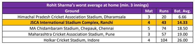 Rohit Sharma, who was out for 14 runs in the third ODI, hasn’t scored a half-century in his last five ODI innings. With the score, the Mumbai batsman has recorded an average of 14.33 at the JSCA stadium in Ranchi. He has notched scores of 9* (vs Aus 2013), 9 (vs SL 2014), 11 (vs NZ 2016) and 14 (vs Aus 2019) at the ground.
