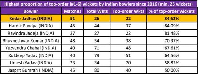 One baffling statistic, which shows how crucial Jadhav the bowler has been, is that the off spinner has the highest percentage of top order wickets among Indian bowlers since 2016. Out of the total of 26 wickets that Jadhav has picked up, 22 have been top order batsmen. This clearly shows that Jadhav has mostly been used by the captain to break settled partnerships and the part timer has delivered on most occasions.