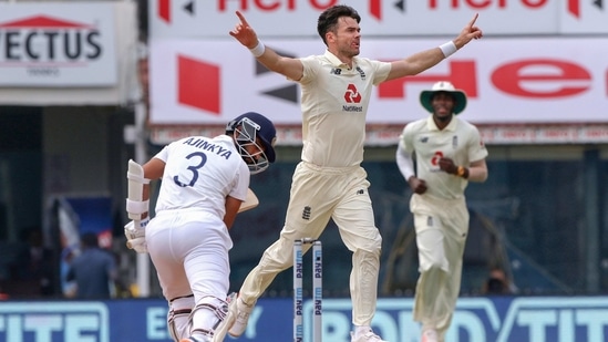 England's fast bowler James Anderson celebrates the wicket of India's Ajinkya Rahane. (PTI)