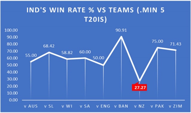 In 11 matches against New Zealand, India have only won 3 which makes their win percentage an abysmal 27.27. This is the worst for India against any side (minimum of 5 T20Is played).