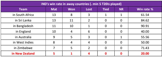 Not only this, India has struggled in New Zealand conditions as the side has a winning percent of only 20 - which makes it their worst in any country with a minimum of 5 T20Is played.