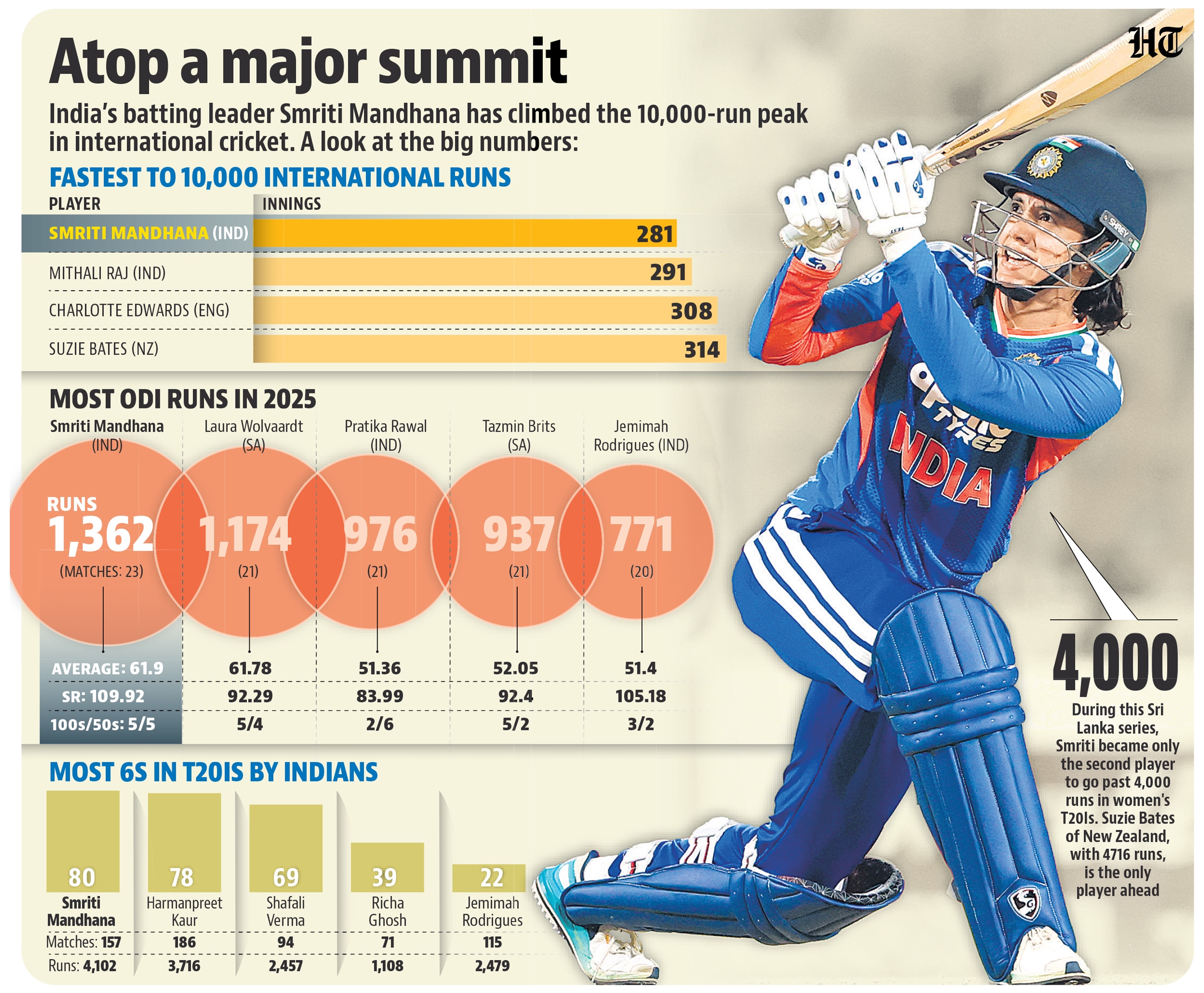 The numbers are staggering. She is the fastest and youngest to 10,000 international runs in women’s cricket. She is only the fourth woman to reach the mark, emulating Mithali Raj, Charlotte Edwards (ENG) and Suzie Bates (NZ). She has scored the joint most international centuries (17). In 2025, she scored the most international runs in a calendar year (1703). She also scored the most runs by an Indian in a single ODI Women’s World Cup (434).