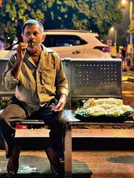 Further ahead a street seller is sitting on a bench with a basket of white flowers by his side. He is about to finish his chocolate bar. Too shy to reveal his name, he simply shrugs his shoulders, saying, “I was feeling bored... so I bought an ice cream.”