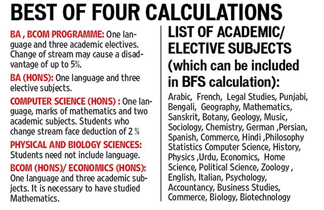 But this is only true for these two courses and not for the others. For all others such as BA, BCom (Hons) courses, BFS calculation should include one language and three other academic subjects listed by the university.