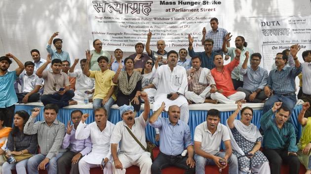 Teachers led by the DUTA had been boycotting evaluation process since May 8 to oppose a University Grants Commission’s notification on the formula to calculate reservation in teaching jobs that teachers fear would impact the representation of SC/ST candidates in colleges.