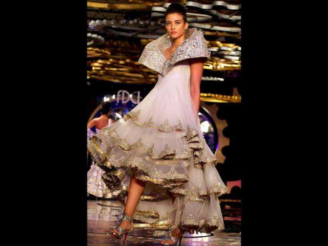 Do play with colour. One of our strengths as Indians is that we can carry off an amazing colour palette. Meera Muzaffar did a lovely shocking fuchsia with royal blue, and there were some fabulously rich yellows, courtesy Manav Gangwani.