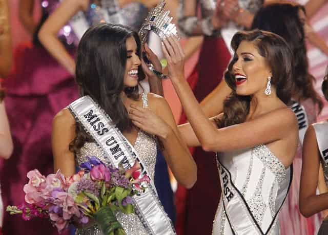 Paulina Vega laughs as she is being crowned by last year's Miss Universe, Venezuela's Gabriela Isler, at the 63rd Annual Miss Universe Pageant in Miami, Florida. (Reuters)