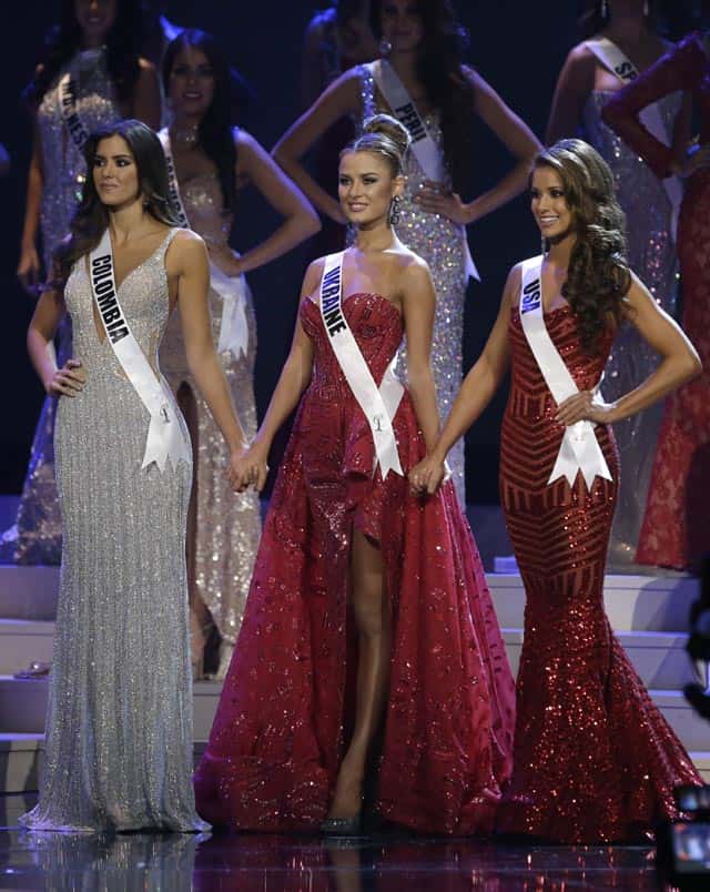Paulina Vega of Colombia, left, Diana Harkusha of Ukraine, center, and Nia Sanchez of the US, hold hands as the wait for the announcement of the second runner up during the Miss Universe pageant in Miami. (AP)