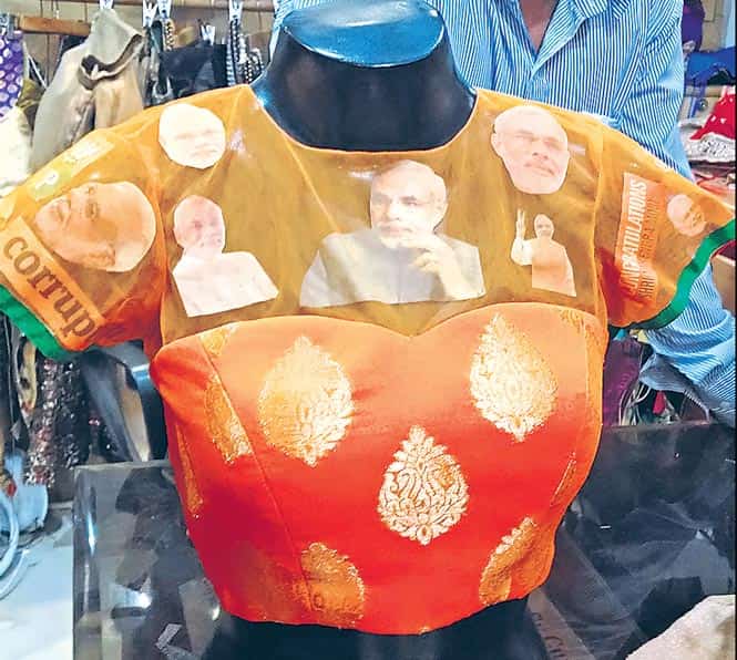 Priced at `1500, the blouses have paper cut-outs of the PM stitched on the netted front, back and shoulders, and the text reads, ‘Narendra bhai congratulations’ and ‘Time for change. Time for Modi’.