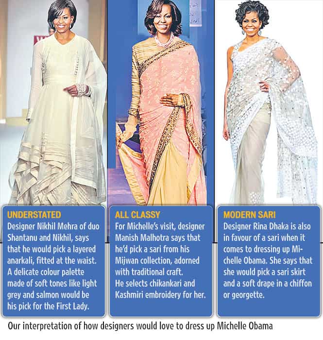 Designer Nikhil Mehra’s choice for Michelle Obama would be a chiffon, layered anarkali, fitted at the waist. “She’d look great in a delicate colour palette. She can even wear the outfit in the US, taking the memory of India back home,” he says.