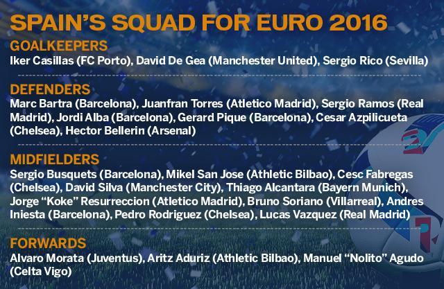 Madrid’s Sergio Ramos and uncapped Lucas Vazquez were included in the final squad, as well as Atletico’s Juanfran Torres and Jorge “Koke” Resurreccion. Madrid defender Dani Carvajal had already been ruled out of Euro 2016 because of a muscle injury sustained in the final won by his club in Milan.