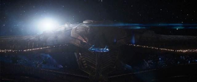 Thanos’ huge ship floats in and completely eclipses Thor’s at the end of Thor: Ragnarok. We assume this is where Avengers: Infinity War will kick off from.