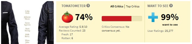 The first reviews of spy sequel, Kingsman: The Golden Circle, are in - and as was the case with the first film, have left critics unsure as to what to make of it. The film sits at 74% (with a 5.9 average rating) on the review aggregator site, Rotten Tomatoes, with 23 reviews counted. The first film also settled with the same rating, but with over 200 reviews.