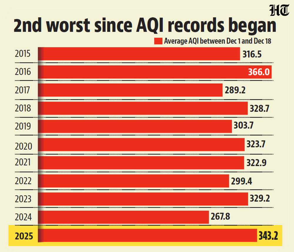 To be sure, wind speed and humidity also affect air quality. While India Meteorological Department (IMD) does not publish time series data on these parameters, HT’s past reporting suggests this. For example, 2022, the only other year that did not get rain, not only experienced warm days in December like 2025, but also three days of strong north-westerly winds, fast enough to flush pollutants, HT reported at the time. While winds have helped clean up air this year too – the reason Delhi’s AQI climbed down from the severe range after Monday – they have not been fast enough for moderate air quality (an AQI in the 101-200 range) like in 2022. Of the 18 days so far, three have been in the severe range (an AQI in the 401-500 range), 13 in the very poor range (an AQI of 301-400 range), and two in the poor range (an AQI in the 201-300 range).