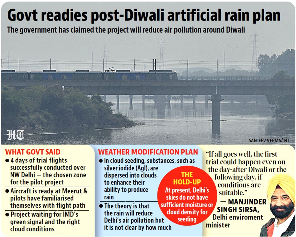 “Our aircraft is ready at Meerut. The pilots have familiarised themselves with the flight path. We’re only waiting for IMD’s green signal and the right cloud conditions. If all goes well, the first trial could happen even on the day-after Diwali or the following day, if conditions are suitable,” Sirsa said at a press conference.