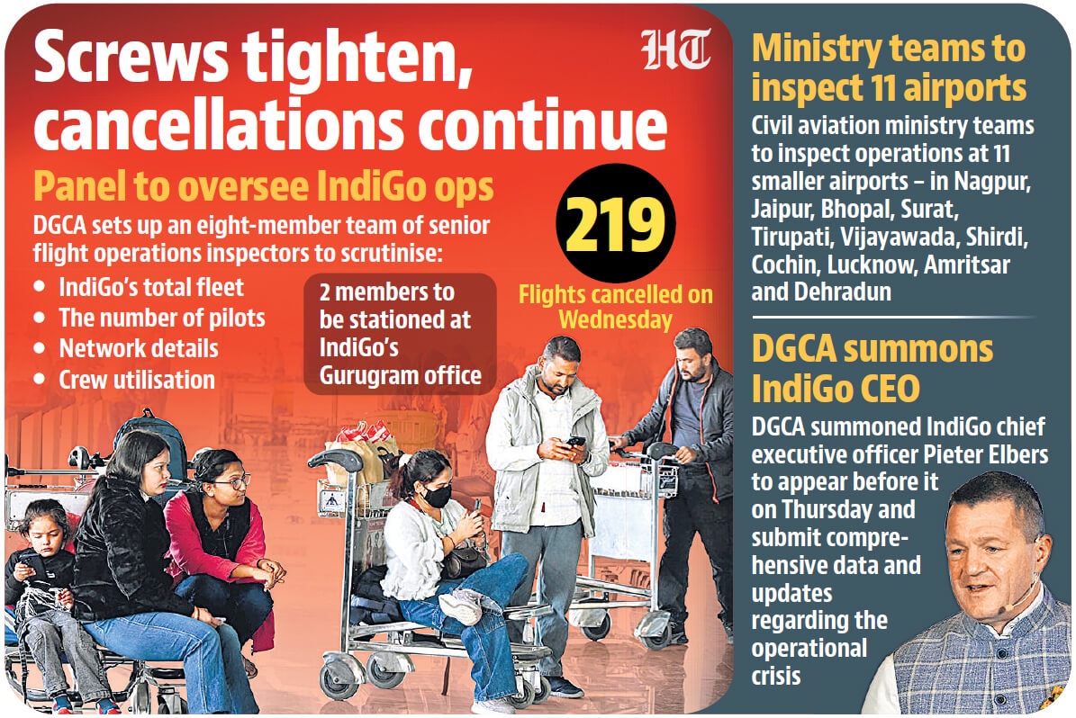 The Directorate General of Civil Aviation (DGCA) set up an eight-member team of senior flight operations inspectors and said they will scrutinise IndiGo total fleet, the number of pilots, network details and crew utilisation, amid a crisis that has led to the airline, India’s largest, cancelling thousands of flights and leaving millions in lurch since December 2. A two-member team, also deployed at IndiGo’s corporate office, will monitor the status of cancellations, on-time performance, refunds and baggage returns to fliers.