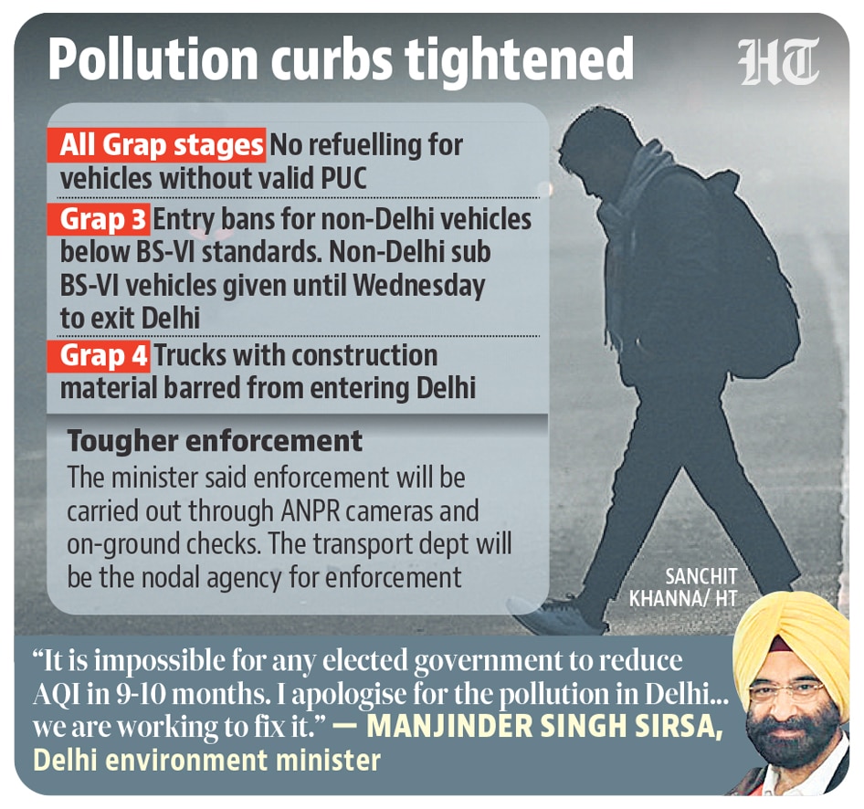He also said that vehicles without a valid Pollution Under Control (PUC) certificate in Delhi will not be allowed to refuel at petrol pumps from Thursday, and that trucks with construction materials – construction is banned across the national capital region as part of Stage four of the Graded Action Plan (GRAP) – will be seized on the spot.