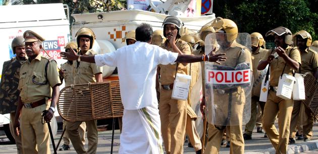 Police patrol during clashes between Communist Party of India (Marxist) (CPM) and Bhartiya Janta Party (BJP) in front of the Kerala Government Secretariatat in Thiruvnanthapuram on January 2. (AFP Photo)