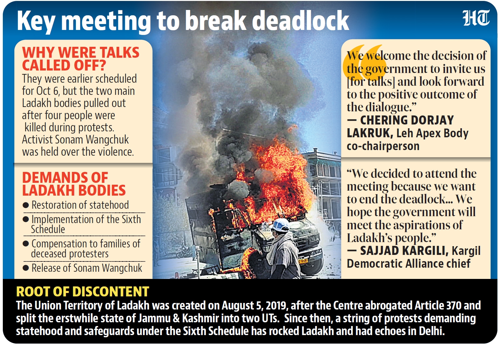 The last round of talks between the two sides was held in May. A follow-up meeting was initially scheduled for October 6, but LAB and KDA pulled out after four people were killed and around 100 injured during protests in Ladakh on September 24. The demonstrations were held in support of full statehood and constitutional safeguards for jobs and land. Climate activist Sonam Wangchuk was arrested in connection with the violence under the stringent National Security Act (NSA) and lodged in Jodhpur jail.