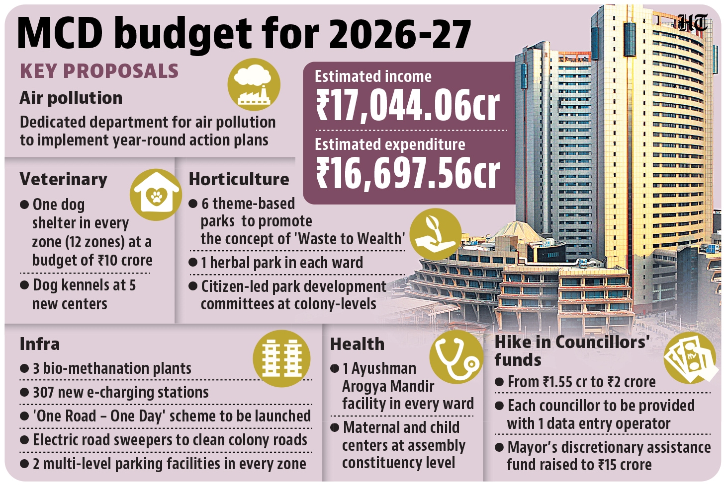 Focusing on infrastructure expansion and pollution control, the Municipal Corporation of Delhi’s standing committee on Wednesday proposed a ₹16,697.56-crore budget for fiscal 2026–27 that includes new dog shelters, theme parks, multilevel parking facilities and a dedicated air pollution action plan.The budget sought to boost revenue through improved tax recovery rather than imposing new levies.